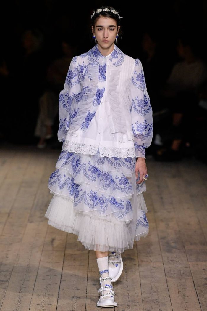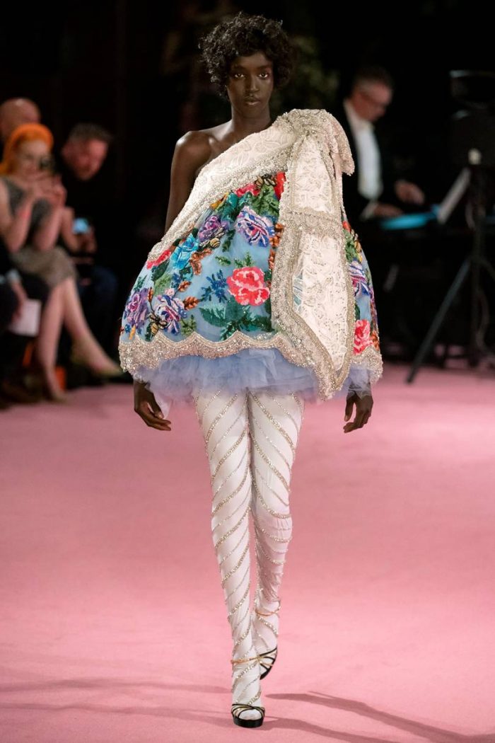 At London fashion week, Richard Quinn shows exuberant looks, blending the antique with modernity, bringing elegant new vintage trend style looks.