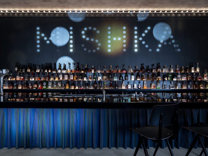 Another accent featured in this project is the fact that many edges of the entire bar area filled with spotlight bulbs. Which gives a dramatic touch to Mishka Bar, with an intimate and welcoming place for people hanging around.