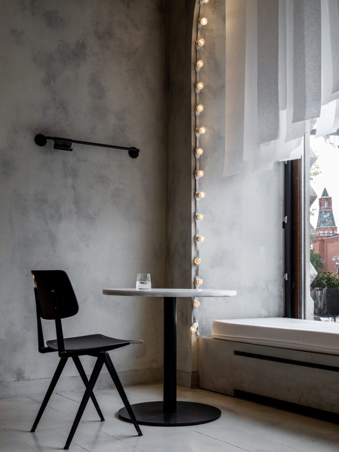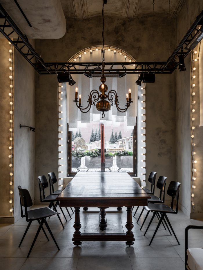 The glamorous Mishka Bar is decorated with minimal dark furniture, mostly, combined with long dramatic curtains. Sundukovy Sisters have chosen contrasting elements.