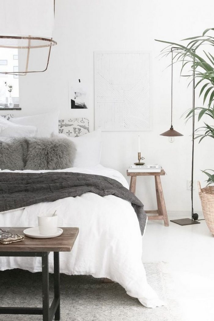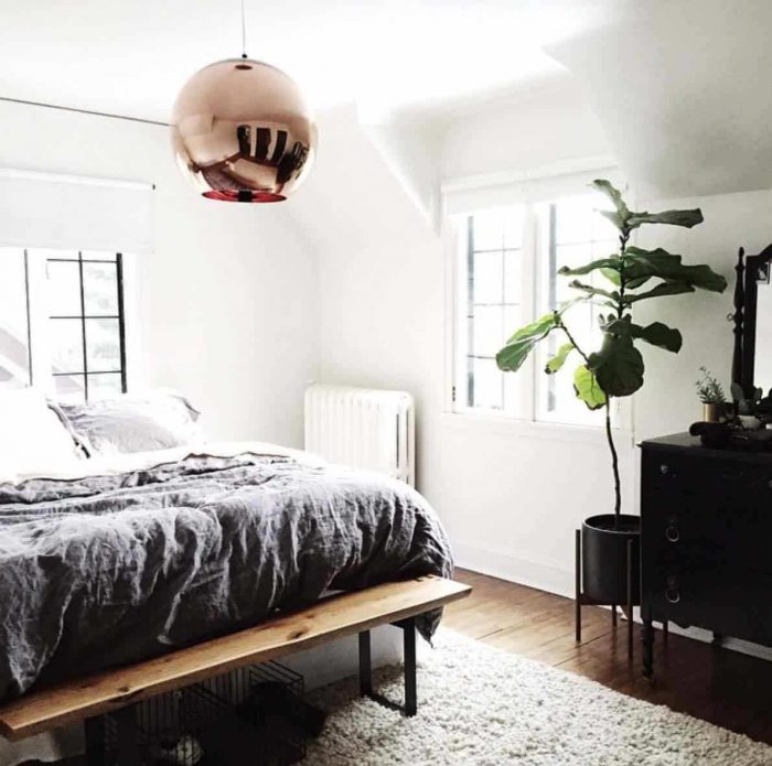 Gray, black and white never looked so good together. Don’t forget the plants, dark wood, soft blankets, and pillows, contrasting with white sheets and a gray rug, and you will be the room of your dreams.